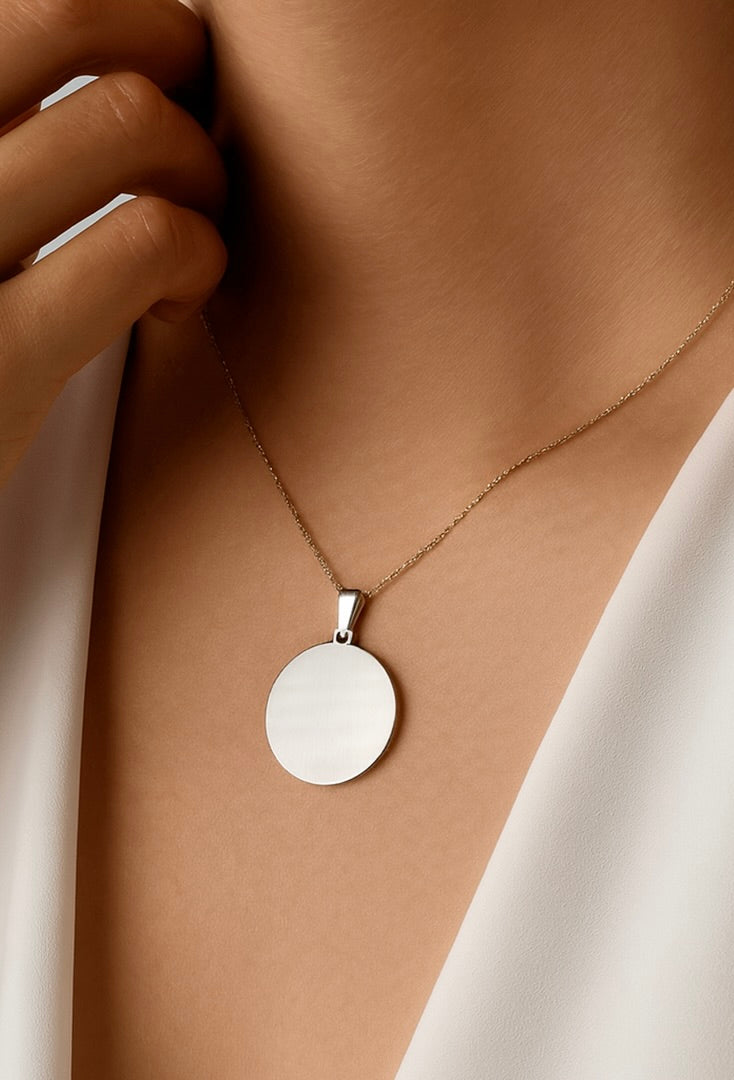 Un collar minimalista y versátil, perfecto para usar todos los días o para convertirlo en un regalo con significado. La medalla circular mide 3 cm de diámetro y está fabricada en acero inoxidable plateado, resistente a la corrosión y de alta durabilidad, lo que le da un acabado limpio y moderno que resalta cualquier grabado.
